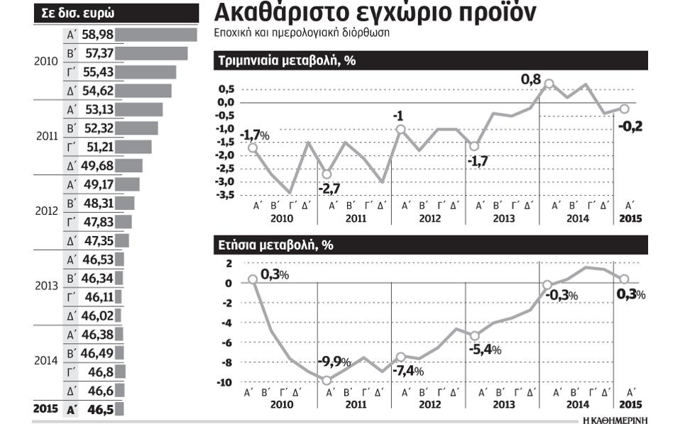 Σύμφωνα με τα στοιχεία της Ελληνικής Στατιστικής Αρχής (ΕΛΣΤΑΤ), στο πρώτο τρίμηνο του 2015 η οικονομία παρουσίασε αρνητικό ρυθμό ανάπτυξης 0,2% σε σχέση με το τελευταίο τρίμηνο του 2014, ενώ σε σύγκριση με το πρώτο περυσινό τρίμηνο κατέγραψε αύξηση 0,3%. Επί της ουσίας, η οικονομία στο πρώτο φετινό τρίμηνο παρέμεινε στάσιμη, ενώ είναι ξεκάθαρο ότι ο αρχικός στόχος για ανάπτυξη 2,9% στο σύνολο του έτους είναι πλέον μη ρεαλιστικός.